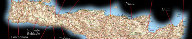 Vom 17. September bis 1. Oktober war ich mit meinem Freund auf Kreta. Zwei Digikameras und knapp 4,4 GB Speicher waren mit dabei, entsprechend viele Bilder haben wir mitgebracht, von denen auf den folgenden Seiten einige zu sehen sind. Auf dem Bild unten stehen die Orte, die Ziel einer Tour waren, groß und in weiss. Orte der Druchfahrt oder zur reinen Orientierung klein und grau. Die Zielorte der Touren können direkt angewählt werden um die entsprechenden Bilder der Tour anzuschauen. Das Hotel war natürlich keine Tour, doch vom Hotel und der Umgebung gibt es auch ein paar nette Bilder. Außerdem haben wir auch Akrotiri (der Knubbel rechts von Chania) abgefahren, Bilder davon sind bei Chania mit dabei. |