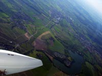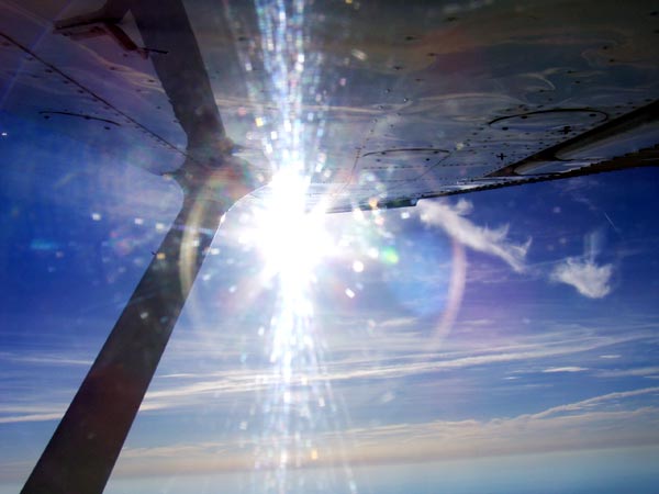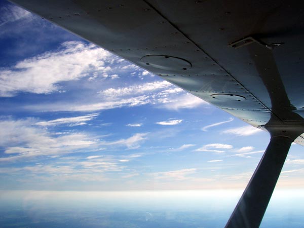 Rechts: Der Wolkenhimmel nach erfolgreicher Landung vom Boden aus.