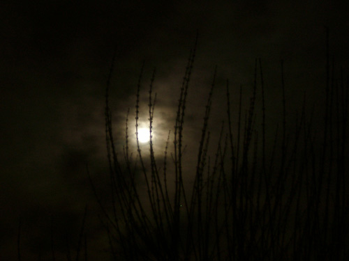 Vollmond - auf einem Parkplatz liegend durch's Gestrüpp fotografiert