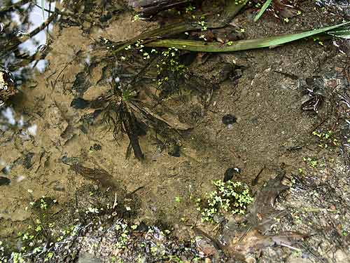 ein Teich im Wald mit Kaulquappen und Schnecken drin