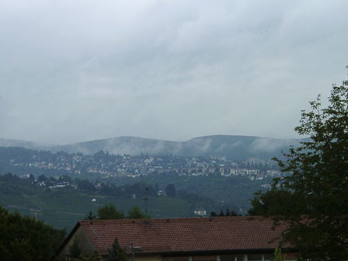 Morgennebel steigt auf - mein Blick vom Balkon am Morgen des 21.08.2002