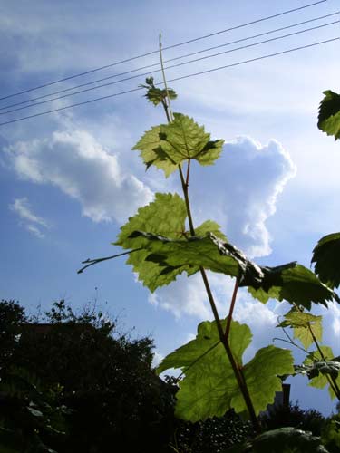 Ein junger Trieb unseres Rebenstocks vor dem Haus.