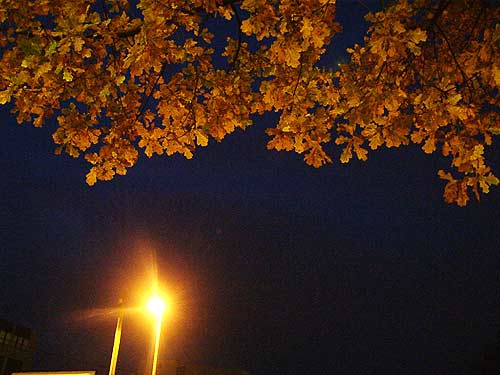 herbstliches Eichlaub im Licht einer Straßenlaterne
