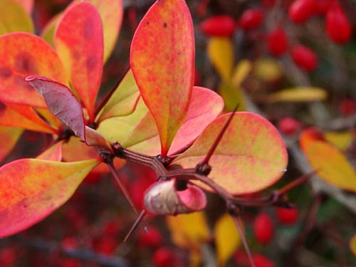ein Dornengestrüpp am Wegesrand in leuchtenden Herbstfarben