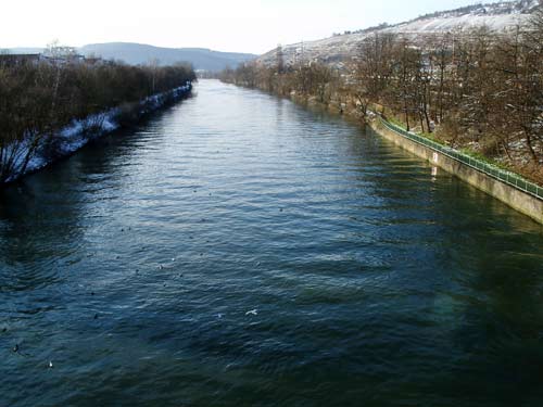 Möwen und Enten tummeln sich auf und über dem Neckar