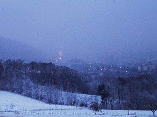 die Lichterkette der Autoscheinwerfer auf der B 10 in leichtem Winternebel