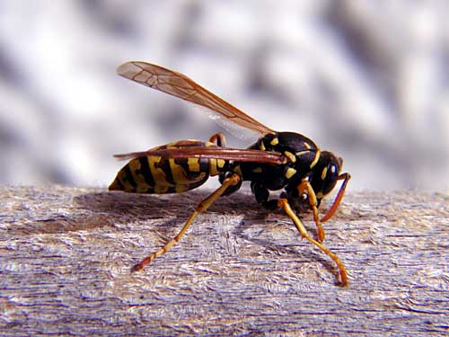 Feldwespe (Polistes) bei der Materialbeschaffung für den Nestbau
