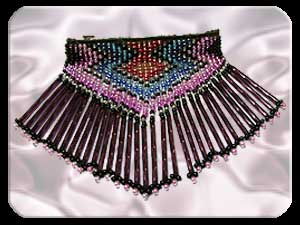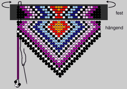 | Wichtig! - hierfür sollten Perlen mit nicht zu engen löchern verwendet werden, denn der Faden muß 3 x durch. Wenn alle Perlen fest auf dem Leder sitzen, werden die hängenden Perlen befestigt (siehe Schaubild) . Dies geschieht auch wieder von oben nach unten und von links nach rechts. Faden am Leder knapp über der ersten Perle festmachen und durch die ersten 5 Perlen ziehen, dann die hängenden Perlen auffädeln. Den Abschluß bilden immer 3 Perlen - nach diesen wird der Faden wieder durch alle Perlen noch oben geführt und dies die komplette Reihe durch. | ||||||||||||||||||||||||||||||||||||||||||||||||||||||||||||||||||||||||||||||||||||||||||||||||||||||||||||||||||||||||||||||||||||||||||||||||||||||||||||||||||||||
