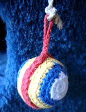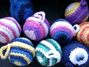 2. Runde: in jede der 8 M kommen nun 2 M = 16 M. 3. Runde: in die 1. M 2 M, in die nächsten 3 M einzelne M, noch 3 x wiederholen = 20 M. 4. Runde: in die 1. M 2 M, in die nächsten 4 M einzelne M, noch 3 x wiederholen = 24 M. 5. Runde: in die 1. M 2 M, in die nächsten 5 M einzelne M, noch 3 x wiederholen = 28 M. Nun 2 Runden ohne Zunahme drüberhäkeln und fertig ist eine Hälfte (gesamt 7 Runden). Nach der zweiten Hälfte die Füllung zu einem Bällchen knüllen und zwischen die beiden Hälften stopfen. Die Hälften nun mit Kettmaschen zusammenhäkeln, zum Schluß etwa 15 Luftmaschen häkeln, diese mit einer Kettmasche als Aufhänger an das Bällchen häkeln und schon kann der Spaß losgehen. Am Aufhänger kann das Bällchen an einer Schnur befestigt werden (siehe Bild unten), was die Einsatzmöglichkeiten erweitert und eine Küchentuchfüllung ist etwas weicher als Zeitungspapier. |
