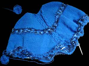 vom Hals bis zum Ende der Schulter (ca. 11 cm bei Erwachsenen). Die errechnete Maschenzahl gleichmäßig vierteln und jeweils die erste Masche jedes Viertels mit einem Hilfsfaden markieren. Gestrickt wird in Runden, den Rundenanfang ungefähr in die Mitte eines Viertels legen. Man braucht Rundstricknadeln in verschiedenen Längen (für die ersten Runden kann man auch ein Nadelspiel nehmen). 1. Runde: Glatt rechts, jeweils vor und nach jeder markierten Masche eine Masche verschränkt aus dem Querfaden zunehmen 2. Runde: Glatt rechts ohne Zunahmen Diese zwei Runden wiederholen, bis die Länge der Schulter erreicht ist. Dann bei der 1. und 3. markierten Masche nur mehr jedes 2. Mal (= jede 4. Reihe) zunehmen. Bei Erreichen der gewünschten Länge locker abketteln. Vordere bzw. rückwärtige Mitte ist dort, wo jede 2. Reihe zugenommen wurde, an den "Seitennähten" wird ab der Schulter nur jede 4. Reihe zugenommen. Zum Abschluß kann man den Halsrand entweder mit je einer Runde festen Maschen und Krebsstich umhäkeln oder man fasst die Maschen noch einmal auf und strickt einen Rollkragen oder ein Bündchen (z.B. 2 rehts, 2 links) an. Der untere Rand wird ebenfalls umhäkelt - wer mag, kann aber auch Fransen einknüpfen. Varianten: Die vordere und rückwärtige Mitte als Zopf arbeiten und rechts und links davon zunehmen; man kann den Poncho aber auch in Reihen arbeiten und die vordere Mitte mit einer Knopfleiste versehen (1 Masche mehr anschlagen, die Rückreihen links arbeiten). Für kleinere Kinder etwas dünneres Material (Nadelstärke 4-5) verwenden. |