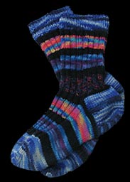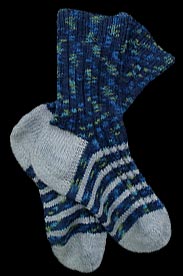 Das Beinteil: Entsprechend viele Maschen auf 4 Nadeln verteilt aufnehmen, am besten immer eine gerade Zahl auf einer Nadel - ist einfacher da sich rechte Maschen als erste leichter stricken. Mit der 5. Nadel strickt man nun die Maschen der 1. Nadel, mit der frei gewordenen Nadel die Maschen der 2. Nadel usw. damit das Beinteil sitzt, werden zunächst Rechts-Links-Rippen (1re, 1li) gestrickt, das Bündchen ca. 4-5 cm. Danach kann man glatt rechts oder Muster nach belieben stricken - ich stricke dann meist 2 rechts 2 links, die Höhe des Beinteils kann selbst bestimmt werden (Herrensocken ca. 20-25 cm). |