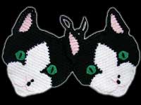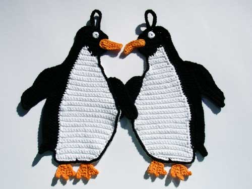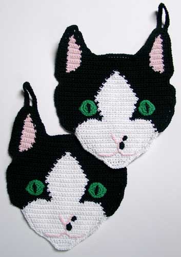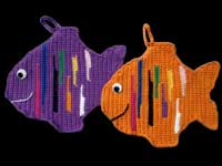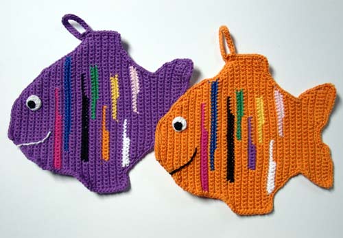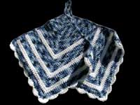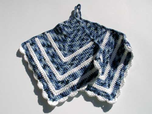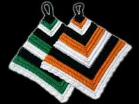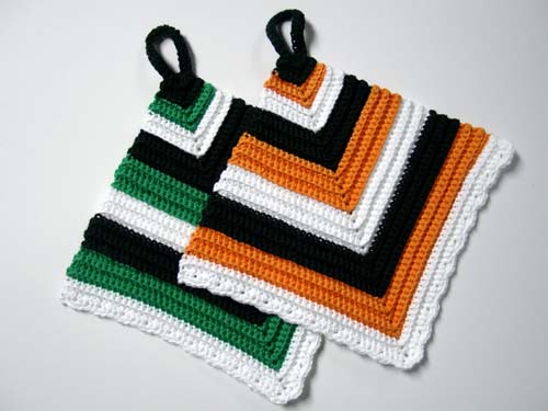 Ding groß genug ist. Wer mag kann als letzte Reihe noch Bögen oder irgendeinen anderen Schnickschnack häkeln. Ich habe hier mit Stäbchen abgeschlossen zwei Maschen freilassen, in die 3. fünf Stäbchen, zwei frei in die 3. eine Kettmasche, zwei frei, fünf Stäbchen usw. Kleinere Bögen gibt es mit festen Maschen hier dann drei feste Maschen, eine freilassen, Kettmasche, drei feste usw. Nun noch schnell einen zweiten Topflappen gehäkelt und fertig sind die nützlichen kleinen Dinger :-) Die farbliche Gestaltung ist hier gänzlich eine Frage des persönlichen Geschmacks, einfarbig oder mit Streifen egal wie's in die Küche paßt oder was an Resten da ist. Topflappen eignen sich auch ganz gut als Geschenk doch bei der Farb- und/oder Motivgestaltung an die Kücheneinrichtung (Farbe/Stil) und/oder Vorlieben des zu Beschenkenden denken. Nachfogend ein paar Bilder von Topflappen die ich in letzter Zeit gehäkelt hab. |