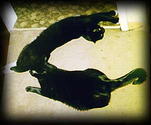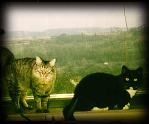 wurde hatte das Ganze auch bald ein Ende. Überhaupt war Purzel ein Quell ständiger Blödsinnsideen. Wo er raufsprang blieb kein Blumentopf stehen. Wir hatten damals, in den frühen 80ern, diese Fasertapeten an den Wänden und somit - ab Purzel - auch Katzen. Er fing an an den Wänden rumzuklettern, Bobbel und selbst Musch machten es nach. Wir hatten nicht selten wenn wir von der Arbeit nach Hause kamen 3 Katzen im Flur an den Wänden hängen - das ist ein Anblick - leider gibt es davon keine Bilder. Purzel mochte auch Wasser - beim Geschirr spülen mußte er ausgeschlossen werden - sonst war das eine schmerzhafte Angelegenheit. Um ans Spülbecken zu gelangen ist er dem Spülenden an den Beinen hoch. Wir hatten zu jener Zeit auch zwei Aquarien, beide eigentlich gut abgedeckt - eines davon mit Landteil und 2 Wasserschildkröten darin. Eines schönen Tages stand Purzel mit recht dämlichem Garfieldblick in diesem Becken und wußte offensichtlich nicht mehr wie da raus kommen, die Schildkröten - beide nicht grade klein - unter Steinen versteckt. Wir haben nie herausgefunden wie er da überhaupt hinein konnte, zum Glück hat er das nicht wiederholt. Zu seinem Beinamen Superpurz kam er, als er vom Schrank runtersprank, nicht wie unsere anderen Katzen es taten - nein - er sprang freiweg in die Luft als wolle er fliegen - nur das rote Cape mit dem "S" drauf hat noch gefehlt. Eines der Katzenlieblingsspiele - Dosenöffnern ein Bein stellen - beherrschte er perfekt. Wo immer er einem in den Weg laufen konnte war er zur Stelle. |