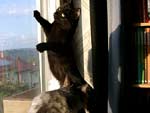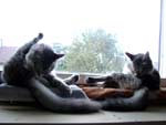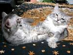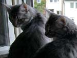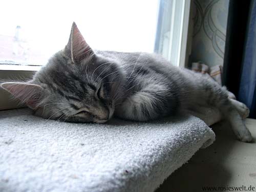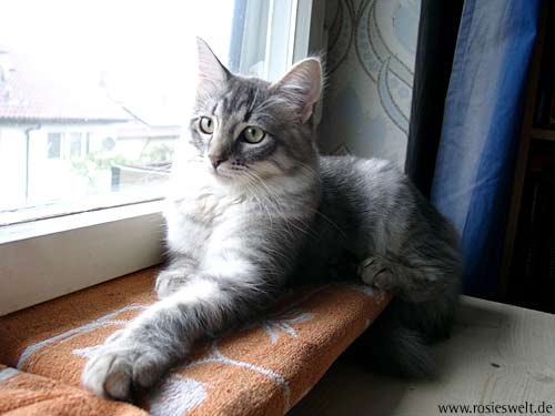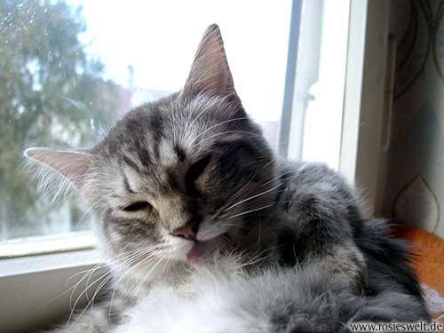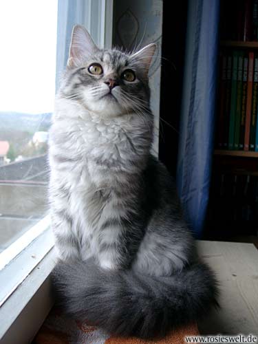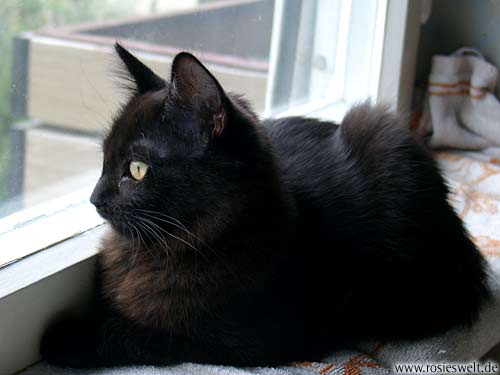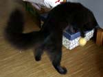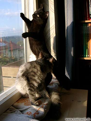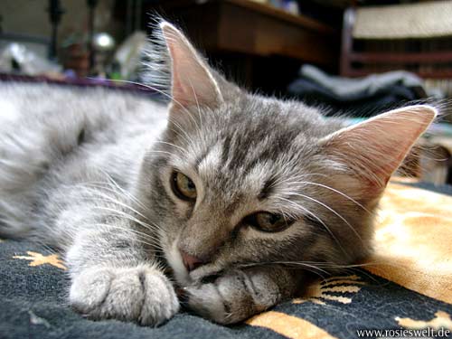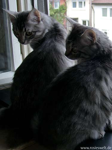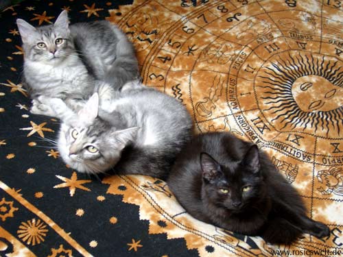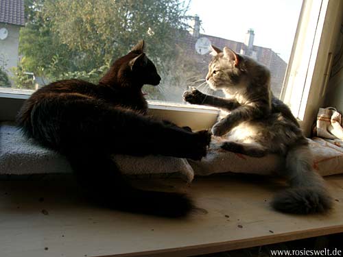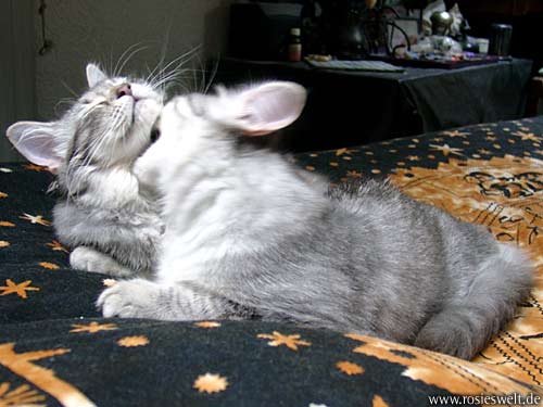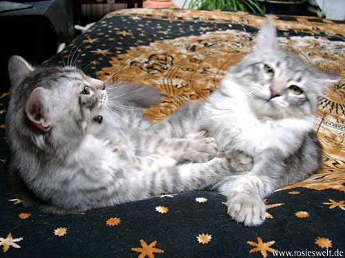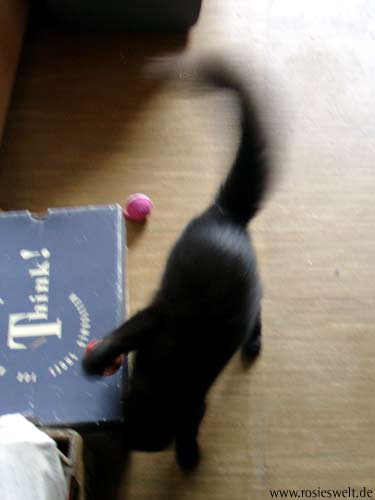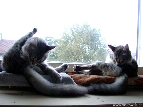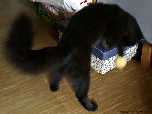 | Seite 4 Seit sie bei uns sind haben sich unsere drei Rabauken größen- und gewichtsmäßig etwa verdoppelt. Mit ca. einem halben Jahr sind die beiden Mädels nun im Zahnwechsel, was witzig ausschaut mit jeweils zwei oberen Eckzähnen. Seit kurzem gibt es selbstgehäkelte Bällchen, die vor allem Morgana liebend gern durch die Gegend kickt. |