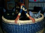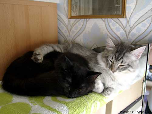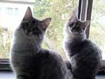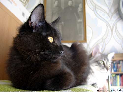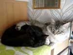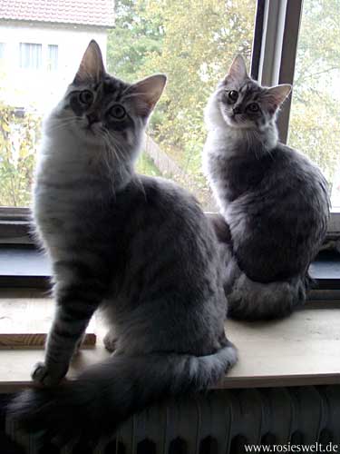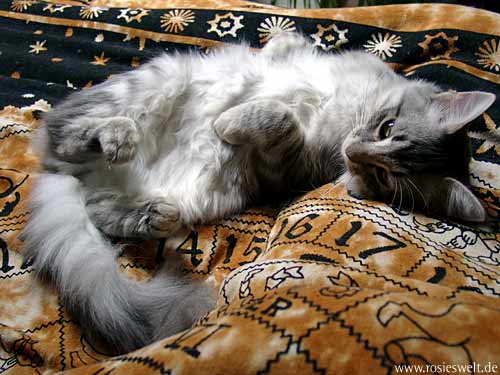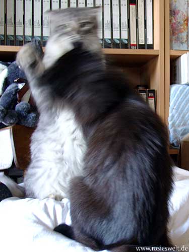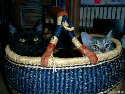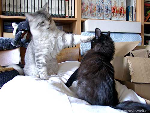 | Seite 5 Aus Kindern werden Leute und inzwischen hat auch Easy seine neuen Zähne. Nach wie vor ist zeitweise Halligalli in der Bude und so richtig spannend wird's, wenn mich spät abends lautes Poltern auf der Treppe hochschrecken läßt. Letztens war's ein Stein – was immer irgendwie fortbewegt oder getragen werden kann, muß erstmal die Treppe runter und dann dasitzen und gucken als hätten sie nix mit zu tun – vor allem die beiden Mädels. Natürlich gibt's auch Zeiten für Streicheleinheiten – zum Glück nicht immer bei allen dreien zugleich. |