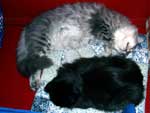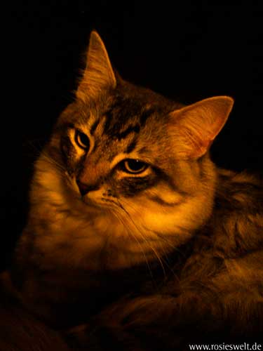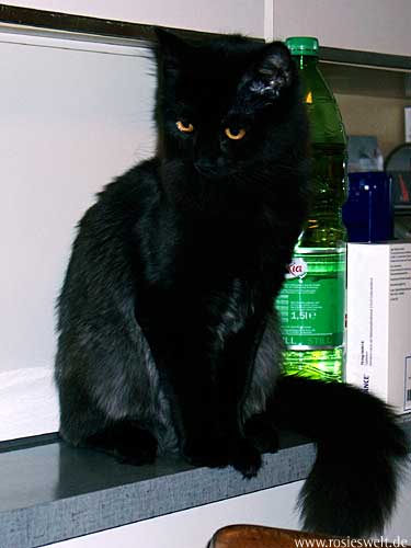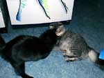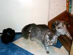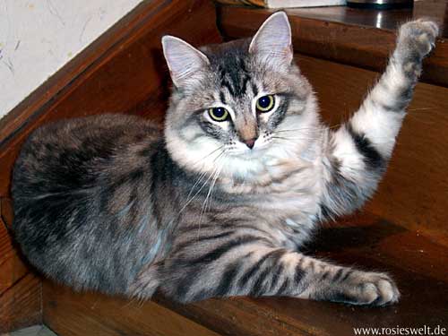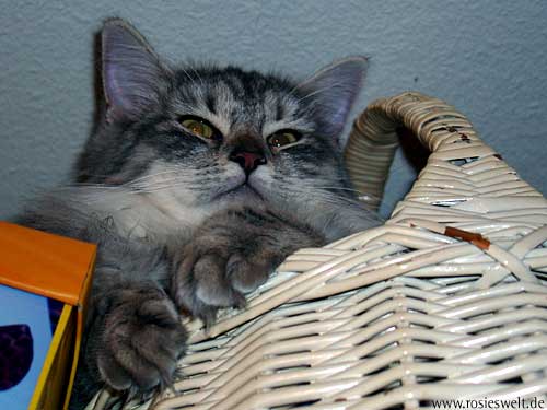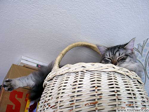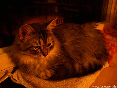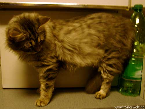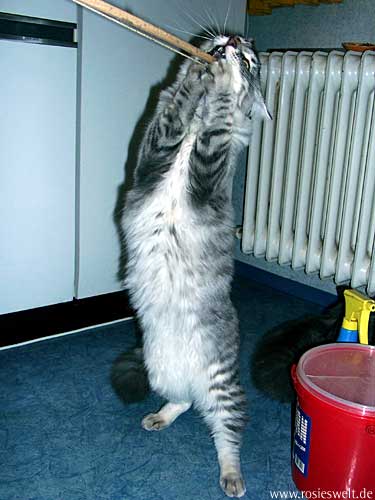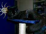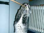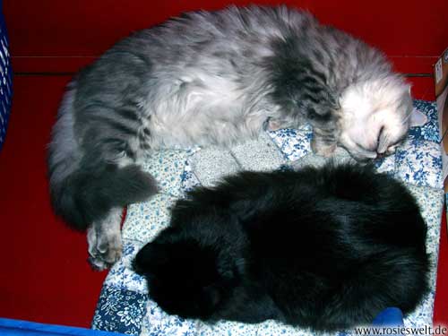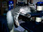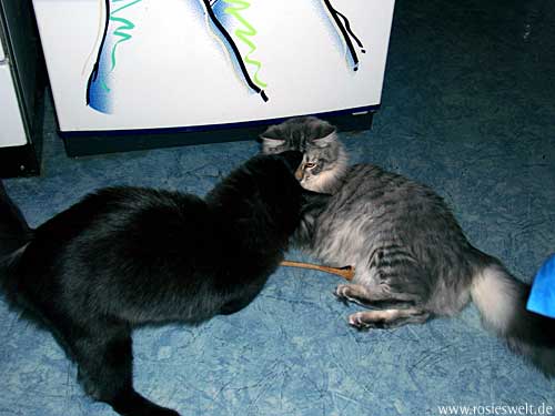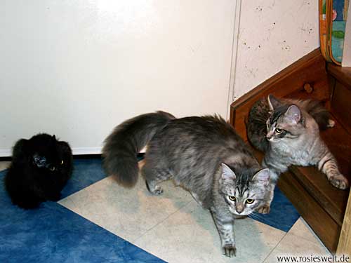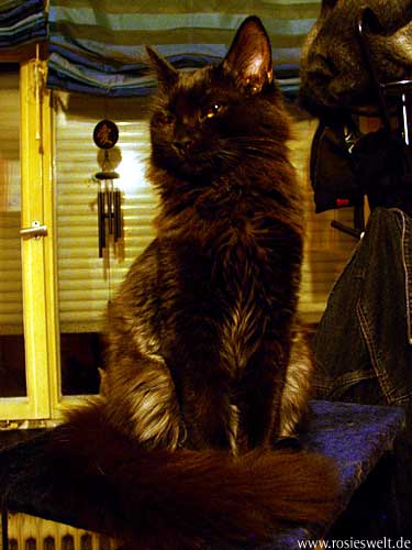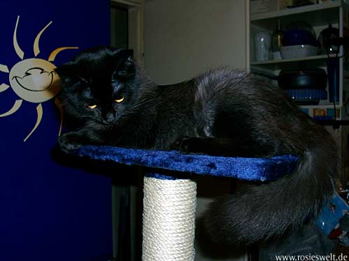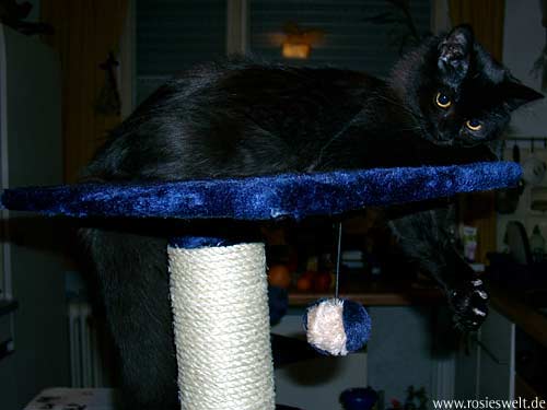 | Seite 6 Seit 10. November haben unsere drei gar nicht mehr so Kleinen einen richtigen Kratzbaum – das Teil war schon beim Probeaufbau in der Küche der absolute Hit. Kaum aufgebaut, hatte Morgana sich die oberste Plattform unter die Krallen gerissen und den Platz an jenem Abend erfolgreich gegen jegliche Inanspruchnahme verteidigt. So ein Kratzbaum ist eine feine Sache und steht eigentlich nur dann einsam da, wenn wir uns abends alle in der Küche versammeln. So manche Tätigkeit wurde in die Küche verlegt, die drei liegen oder toben drumherum und sind gern behilflich, wenn's drum geht Zeitungen und Kartons zu zerkleinern. |