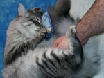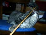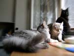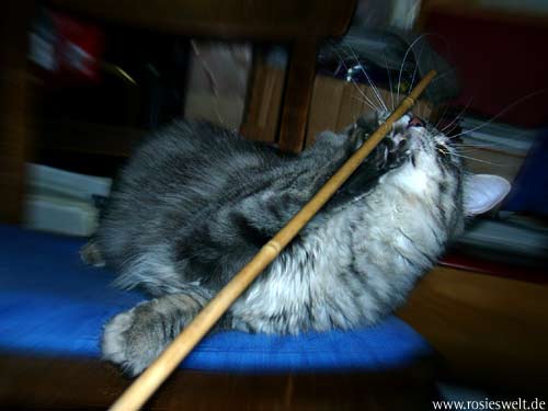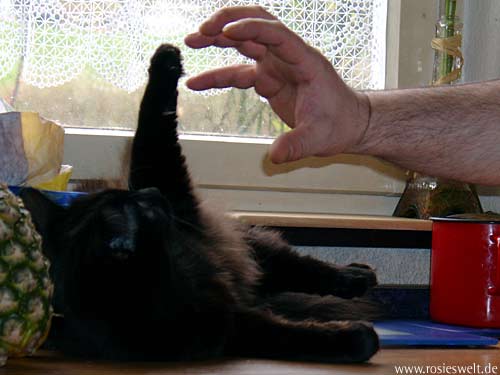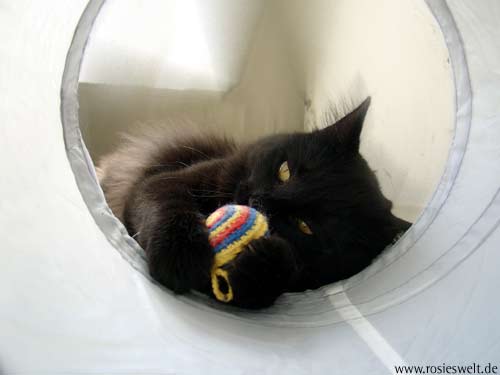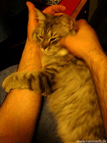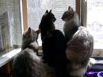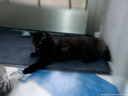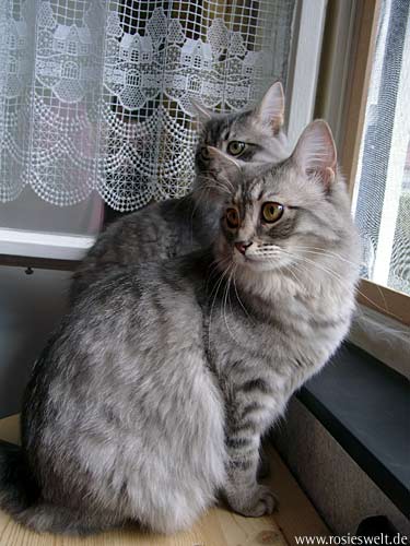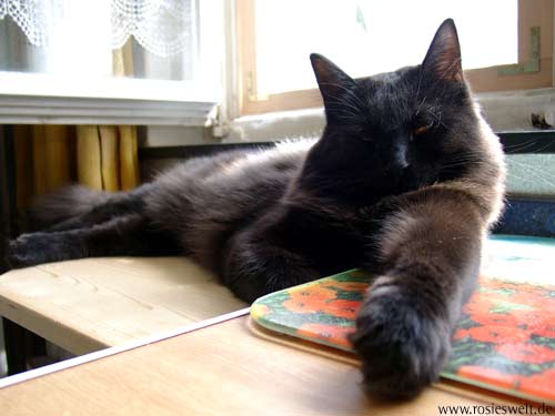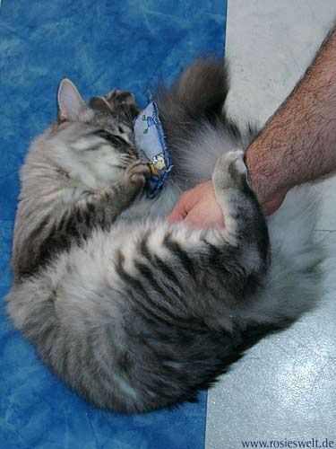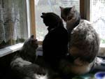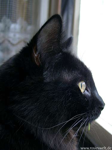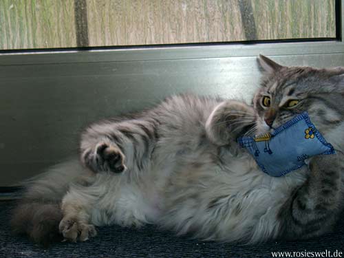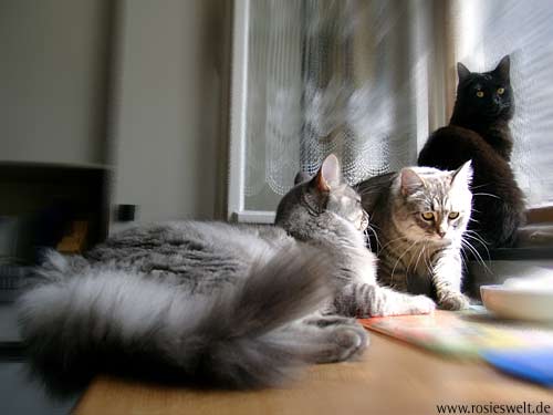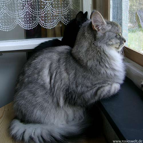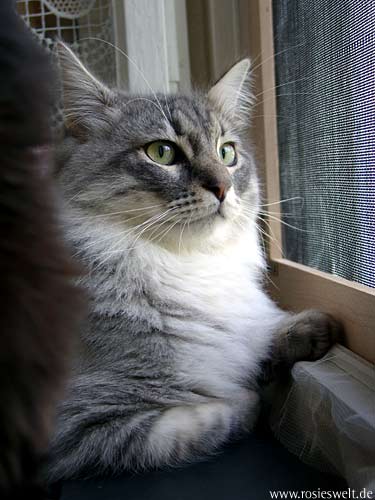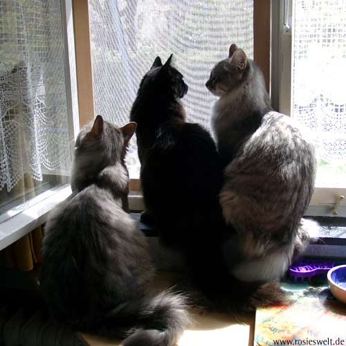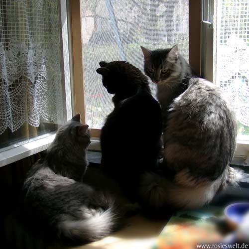 | Seite 11 Etwa Mitte April haben wir neue Fliegengitter gebaut, mit PetScreen, einem speziellen Gitter, das auch Randalekatzen aushält. Seither ist Fernsehen mit Frischluft angesagt sowie ein Fenster geöffnet wird. Alle drei sitzen liebend gern vor offenen Fenstern und beobachten Vögel – auch wenn manche davon ein bis zwei Nummern zu groß sind. Auch der Fellwechsel ging im April los – meine Güte was die drei Haare lassen ist unglaublich – vor allem Queenie müßte mittlerweilen eigentlich kahl sein. |